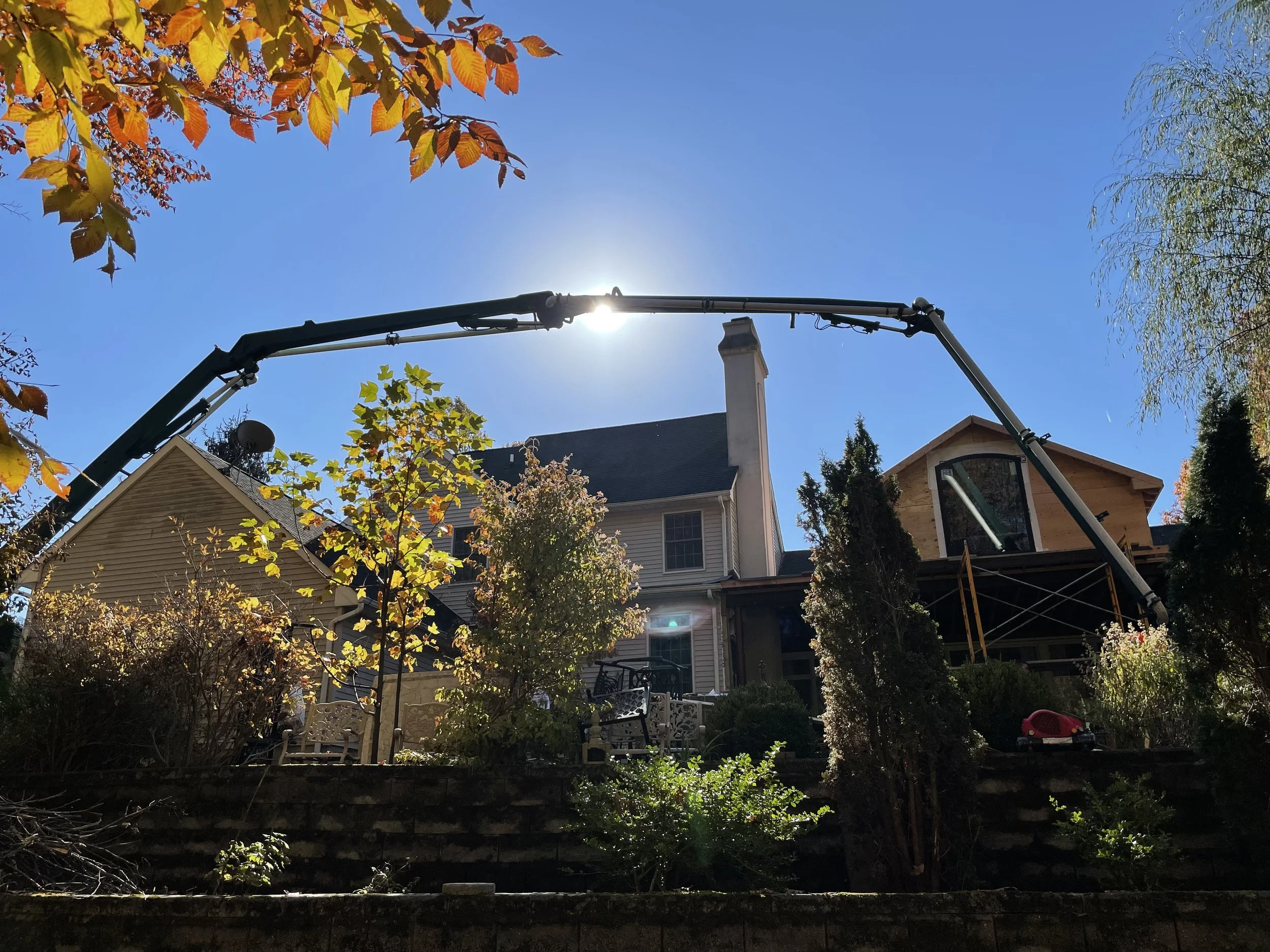 Next, we added steel beams to reinforce the structure as well as built it out so our client could literally drive his cars into his living room. We pumped concrete over 100 ft across his backyard to prevent damage to his lawn as well as landscaping.