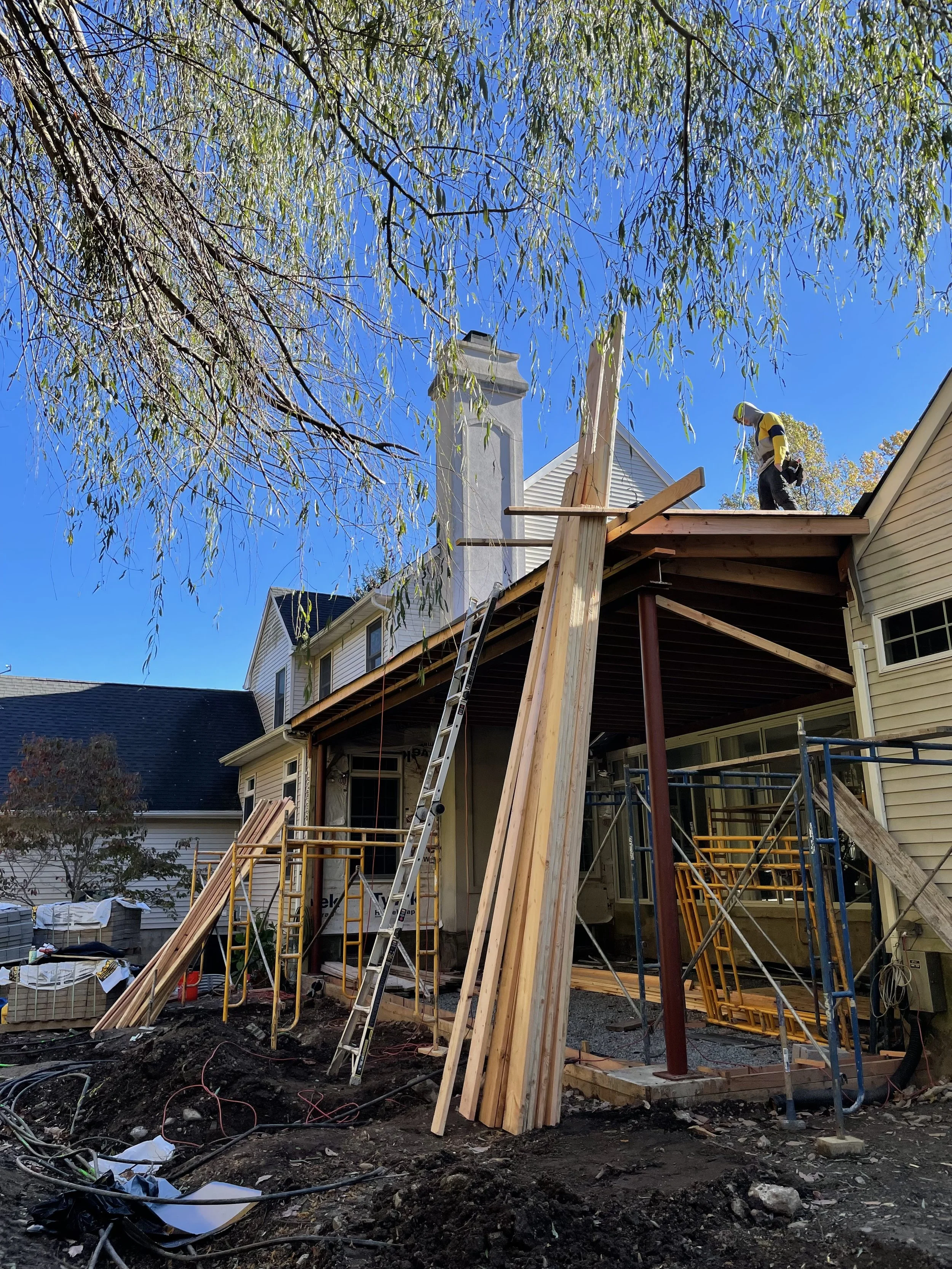 We first started but removing the existing structure and framing the outside of the new garage den. Then we installed new framing and a dormer per clients request.